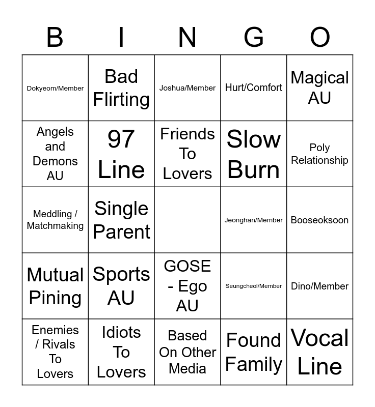 This bingo card has a free space and 122 words: 3+1 / 5+1 Things, Accidental Relationship, Acts Of Service, Actually Fake Dating, Angst With A Happy Ending, Arranged Marriage, Bad Flirting, Banter / Bickering, Based On Other Media, Character Study, Childhood Friends, Childhood Friends To Lovers, Confessions, Didn't Know They Were Dating, Domesticity, Enemies With Benefits, Enemies / Rivals To Lovers, Established Relationship, Exes To Lovers, Fake Relationship, Found Family, Friends To Lovers, Friends With Benefits, Happy Ending, Humor, Hurt/Comfort, Idiots To Lovers, Jealousy, Late-Night Conversations, Love Languages, Marriage Of Convenience, Meddling / Matchmaking, Mutual Pining, No One Believes They're Dating, Non-Linear Narrative, Not Actually Unrequited Love, Only One Bed, Opposites Attract, Partners In Crime, Pining, Polyamory, Practice Kissing, Professional Partners To Lovers, Right Person Wrong Time, Road Trip, Romcom, Roommates, Secret Relationship, Sharing Dreams, Single Parent, Slice Of Life, Slow Burn, Soulmates, Strangers To Lovers, Trope Subversion, Very Obvious A Very Oblivious B, We Kissed Once But We Don't Talk About It, Wound Tending, Monogamous Relationship, Poly Relationship, Vocal Line, Hip Hop Line, Performance Line, 95 Line, 96 Line, 97 Line, Maknae Line, Booseoksoon, Leaders, Seungcheol/Member, Jeonghan/Member, Joshua/Member, Jun/Member, Hoshi/Member, Wonwoo/Member, Woozi/Member, Dokyeom/Member, Mingyu/Member, Minghao/Member, Seungkwan/Member, Vernon/Member, Dino/Member, Angels and Demons AU, Apocalypse / Dystopian AU, Bakery AU, Boarding School AU, Bodyguard AU, Buzzfeed Unsolved AU, Canon Divergent AU, Canon-Compliant AU, Coffee Shop AU, College / University AU, Crime / Criminals AU, Dark Academia AU, Demigods AU, Fantasy AU, Florist x Tattoo Artist AU, Fraternity AU, GOSE - Bad Clue AU, GOSE - Ego AU, GOSE - Wonwoo's Diary AU, Historical AU, Hospital AU, Hybrid AU, Lawyers AU, Magical AU, Modern With Magic AU, Non-Idol Celebrity AU, Office AU, Road Trip AU, Rockstar / Band AU, Royalty AU, Science Fiction AU, Soulmate AU, Sports AU, Spy AU, Sugar Baby AU, Superpowers / Superhero AU, Urban Fantasy AU, Vampire AU, Wedding Planner AU and Werewolf / Shapeshifter AU.