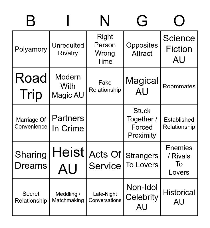This bingo card has a free space and 89 words: 3+1 / 5+1 Things, Accidental Relationship, Acts Of Service, Actually Fake Dating, Angst With A Happy Ending, Bad Flirting, Banter / Bickering, Based On Other Media, Character Study, Confessions, Didn't Know They Were Dating, Domesticity, Enemies / Rivals To Lovers, Established Relationship, Exes To Lovers, Fake Relationship, Found Family, Friends To Lovers, Happy Ending, Humor, Hurt/Comfort, Idiots To Lovers, Late-Night Conversations, Love Languages, Marriage Of Convenience, Meddling / Matchmaking, Mutual Pining, No One Believes They're Dating, Not Actually Unrequited Love, Only One Bed, Opposites Attract, Partners In Crime, Pining, Polyamory, Professional Partners To Lovers, Right Person Wrong Time, Road Trip, Romcom, Roommates, Secret Relationship, Sharing Dreams, Single Parent, Slice Of Life, Soulmates, Strangers To Lovers, Stuck Together / Forced Proximity, Time Loop, Trope Subversion, Unrequited Love, Unrequited Rivalry, Very Obvious A Very Oblivious B, We Kissed Once But We Don't Talk About It, Wound Tending, Angels and Demons AU, Apocalypse / Dystopian AU, Bakery AU, Boarding School AU, Bodyguard AU, Buzzfeed Unsolved AU, Coffee Shop AU, College / University AU, Crime / Criminals AU, Dark Academia AU, Demigods AU, Fantasy AU, Florist x Tattoo Artist AU, Folklore / Mythology AU, Fraternity AU, GOSE - Wonwoo's Diary AU, Heist AU, Historical AU, Hospital AU, Hybrid AU, Magical AU, Modern With Magic AU, Non-Idol Celebrity AU, Office AU, Road Trip AU, Rockstar / Band AU, Royalty AU, Science Fiction AU, Soulmate AU, Sports AU, Spy AU, Superpowers / Superhero AU, Urban Fantasy AU, Vampire AU, Wedding Planner AU and Werewolf / Shapeshifter AU.