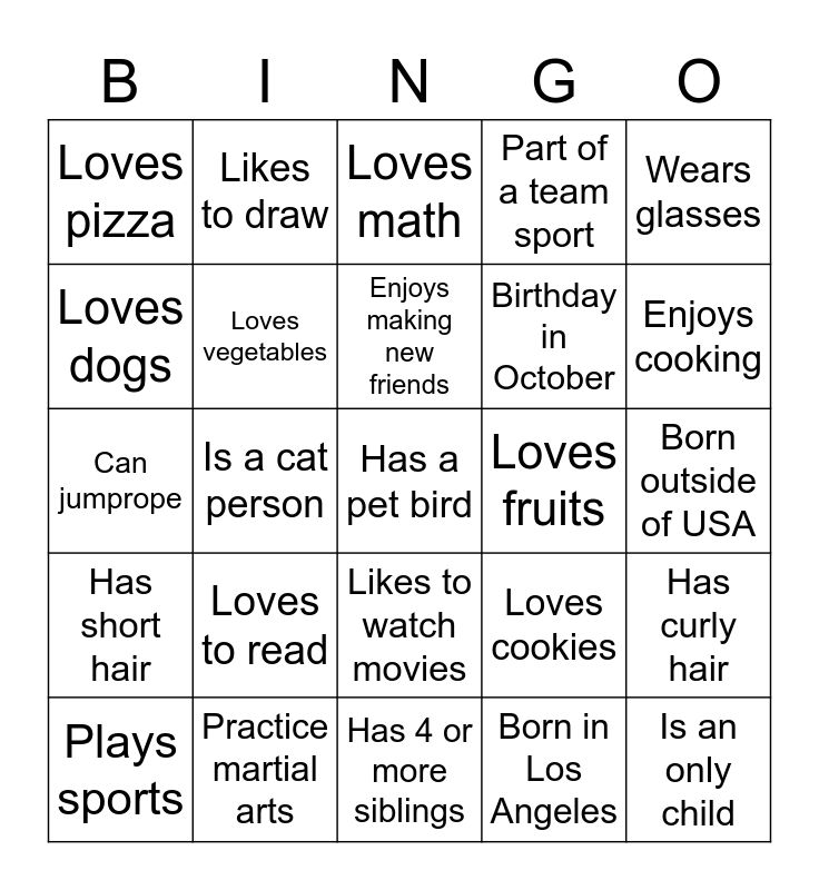 This bingo card has 25 words: Loves to read, Has 4 or more siblings, Enjoys making new friends, Plays sports, Wears glasses, Loves pizza, Loves dogs, Likes to draw, Loves fruits, Likes to watch movies, Birthday in October, Can jumprope, Loves cookies, Has curly hair, Loves vegetables, Is an only child, Born outside of USA, Loves math, Enjoys cooking, Is a cat person, Has a pet bird, Practice martial arts, Has short hair, Part of a team sport and Born in Los Angeles.