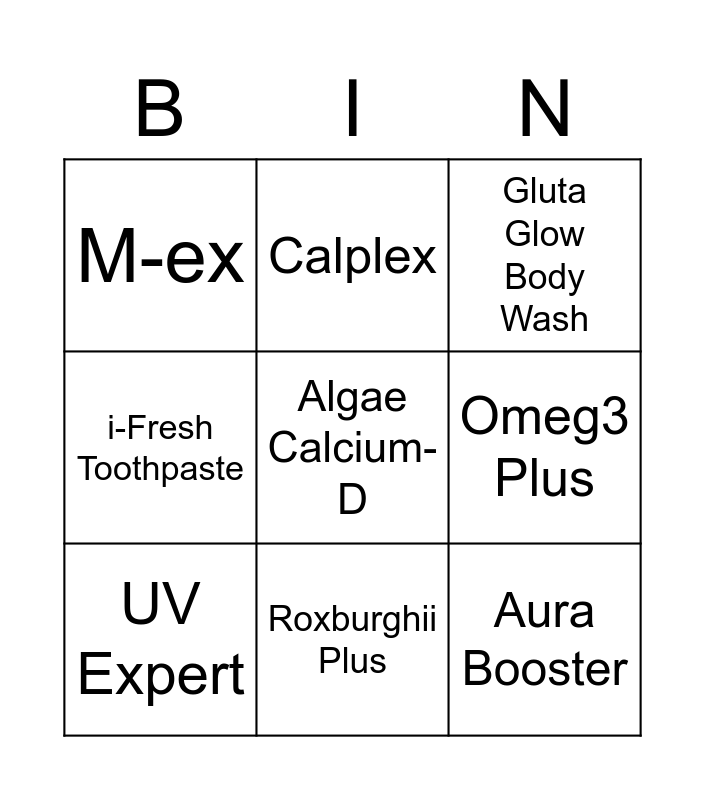 This bingo card has 24 words: Free!, Maqui Plus, Roxburghii Plus, Life Sential, Algae Calcium-D, M-ex, Omeg3 Plus, Calplex, Indian Gooseberry, Skinmune, Aura Booster, Perfec Radiance, Collagen Matrix, Gluta Orange, UV Expert, Gluta Lemon, Gluta Glow Body Lotion, Gluta Glow Body Wash, Secret Feminine Wash, Confidens for Men, Confidens for Women, Leave-on Hair Supplement, i-Fresh Toothpaste and i-Fresh Mouthwash.