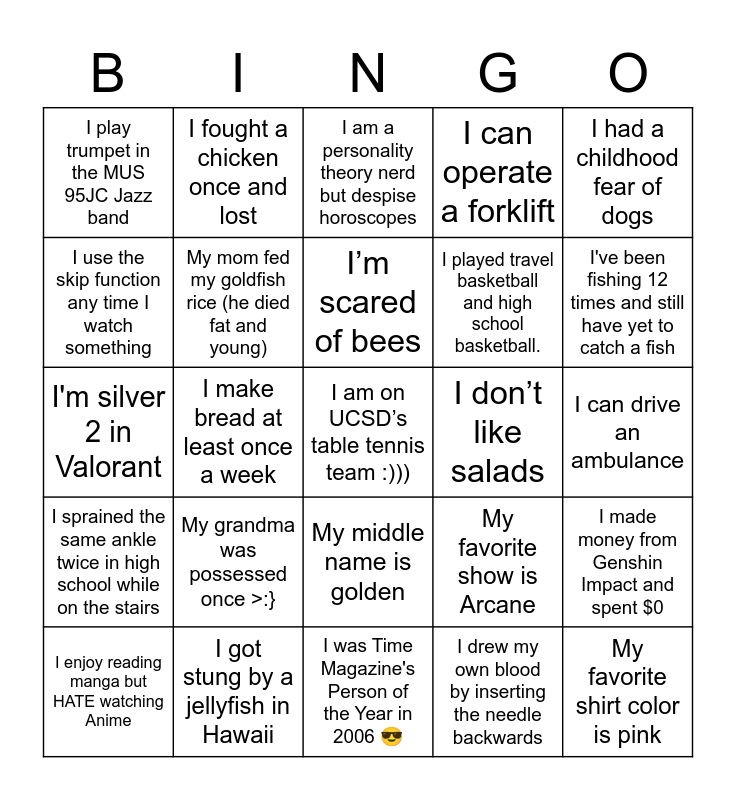 This bingo card has 40 words: Free!, I'm silver 2 in Valorant, My foster cat has micro peen (the vet diagnosed him with it :(, My mom fed my goldfish rice (he died fat and young), I got stung by a jellyfish in Hawaii, My middle name is golden, I’m scared of bees, I started and finished watching Game of Thrones this year, I had a childhood fear of dogs, I sprained the same ankle twice in high school while on the stairs, I make bread at least once a week, I can operate a forklift, I am on UCSD’s table tennis team :))), I can drive an ambulance, I don’t like salads, My grandma was possessed once >:}, I had a goldfish that lived 10 years, I play trumpet in the MUS 95JC Jazz band, I’ve done brain surgery (on mice), I am a personality theory nerd but despise horoscopes, I made money from Genshin Impact and spent $0, I drew my own blood by inserting the needle backwards, I played travel basketball and high school basketball., I use the skip function any time I watch something, I like bean sprouts, I have two horses and two dogs, I own over 200 books, I once had to chase a vendor in Paris to get an illegal crepe, My favorite shirt color is pink, I played for an esports team in high school, I have two orange cats and one of them is female, I enjoy reading manga but HATE watching Anime, My fastest mile time was 5:30 then quarantine happened :(, My favorite show is Arcane, I've been fishing 12 times and still have yet to catch a fish, I was Time Magazine's Person of the Year in 2006 😎, I've never had a cup of coffee, I never took a nap between 2006 and 2019, I fought a chicken once and lost and I never pulled a true all-nighter in high school.