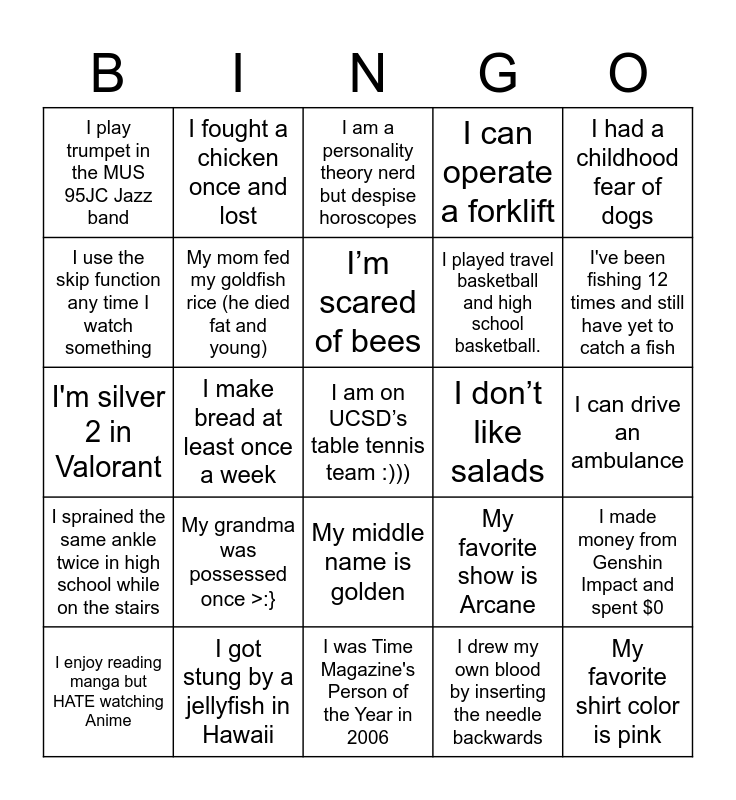 This bingo card has 40 words: Free!, I'm silver 2 in Valorant, My foster cat has micro peen (the vet diagnosed him with it :(, My mom fed my goldfish rice (he died fat and young), I got stung by a jellyfish in Hawaii, My middle name is golden, I’m scared of bees, I started and finished watching Game of Thrones this year, I had a childhood fear of dogs, I sprained the same ankle twice in high school while on the stairs, I make bread at least once a week, I can operate a forklift, I am on UCSD’s table tennis team :))), I can drive an ambulance, I don’t like salads, My grandma was possessed once >:}, I had a goldfish that lived 10 years, I play trumpet in the MUS 95JC Jazz band, I’ve done brain surgery (on mice), I am a personality theory nerd but despise horoscopes, I made money from Genshin Impact and spent $0, I drew my own blood by inserting the needle backwards, I played travel basketball and high school basketball., I use the skip function any time I watch something, I like bean sprouts, I have two horses and two dogs, I own over 200 books, I once had to chase a vendor in Paris to get an illegal crepe, My favorite shirt color is pink, I played for an esports team in high school, I have two orange cats and one of them is female, I enjoy reading manga but HATE watching Anime, My fastest mile time was 5:30 then quarantine happened :(, My favorite show is Arcane, I've been fishing 12 times and still have yet to catch a fish, I was Time Magazine's Person of the Year in 2006, I've never had a cup of coffee, I never took a nap between 2006 and 2019, I fought a chicken once and lost and I never pulled a true all-nighter in high school.
