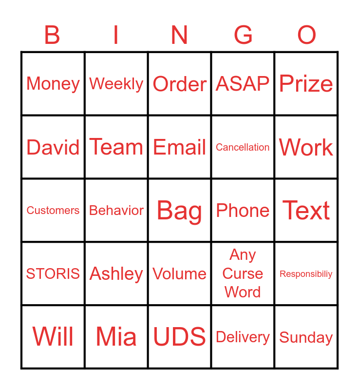This bingo card has 25 words: Ashley, UDS, Email, Will, Prize, Money, David, Weekly, Phone, Volume, Cancellation, Customers, Any Curse Word, Responsibiliy, Team, Sunday, Text, Order, Work, Behavior, Bag, Mia, STORIS, ASAP and Delivery.
