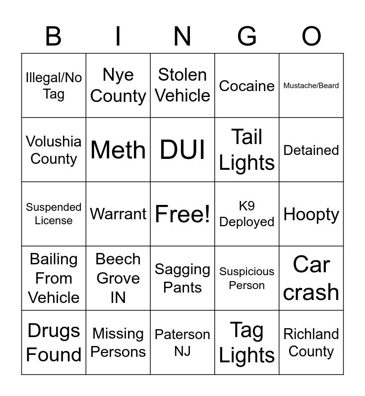 This bingo card has a free space and 50 words: Danny Brown Smells Weed, Richland County, Bernalillo County, Paterson NJ, Beech Grove IN, Marion County, Nye County, Berkeley County, Volushia County, Weed, Meth, Cocaine, Car crash, Suspicious Person, Domestic Dispute, Scale, DUI, K9 Deployed, Dog Barking, Mustache/Beard, Warrant, Tag Lights, Illegal/No Tag, Tail Lights, Head Lights, Crash, Detained, Tweaker, Stolen Vehicle, Sagging Pants, Foot Chase, Car Chase, Wanted, Crime Of The Week, Missing Persons, Uhaul, Arguing With Officer, Shots Heard, Home/Business Alarm, Hoopty, Runs Red Light/Stop Sign, Pat Down, Trespassing, Weapon Found, Drugs Found, Suspended License, Dan Is Punny, Fast Food, Bailing From Vehicle and Weird Crime.