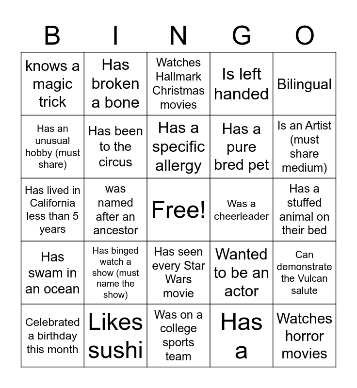 This bingo card has a free space and 29 words: Celebrated a birthday this month, Has never left the country., was named after an ancestor, "Love of Learning' is a top 5 strength, knows a magic trick, Watches Hallmark Christmas movies, Has been to the circus, Has binged watch a show (must name the show), Was a cheerleader, Likes sushi, Has a stuffed animal on their bed, Watches horror movies, Was on a college sports team, Has a, Is an Artist (must share medium), "Hope" is a top 5 strength, Has seen every Star Wars movie, Has swam in an ocean, Bilingual, Has lived in California less than 5 years, Wanted to be an actor, is in a you Tube video, Has a pure bred pet, Has an unusual hobby (must share), Is left handed, Has broken a bone, Can demonstrate the Vulcan salute, Has a specific allergy and Read a book last week (cover to cover).