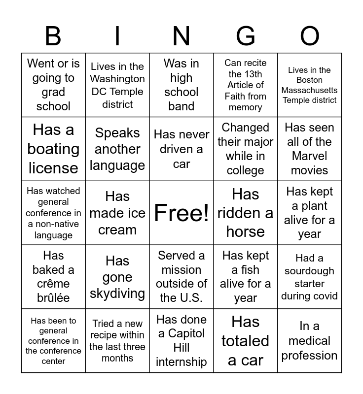 This bingo card has a free space and 24 words: Has gone skydiving, Tried a new recipe within the last three months, Has never driven a car, Has been to general conference in the conference center, Lives in the Boston Massachusetts Temple district, Went or is going to grad school, Has a boating license, Lives in the Washington DC Temple district, Has ridden a horse, Served a mission outside of the U.S., Changed their major while in college, Has watched general conference in a non-native language, Has kept a fish alive for a year, Had a sourdough starter during covid, Speaks another language, Has totaled a car, Has kept a plant alive for a year, Was in high school band, Has seen all of the Marvel movies, Has made ice cream, In a medical profession, Has baked a crême brûlée, Can recite the 13th Article of Faith from memory and Has done a Capitol Hill internship.