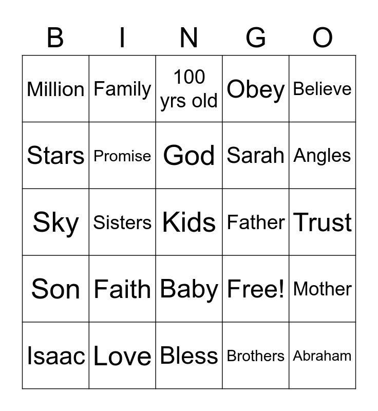 This bingo card has 25 words: Faith, Bless, God, Isaac, Believe, Million, Stars, Family, Father, Baby, Sarah, Sky, Free!, Mother, Promise, Abraham, Trust, 100 yrs old, Angles, Sisters, Kids, Love, Son, Obey and Brothers.