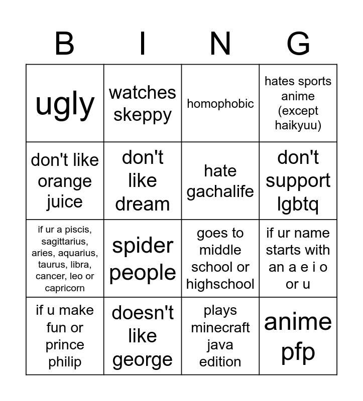 This bingo card has 25 words: under 9, over 15, don't support lgbtq, transphobic, don't like orange juice, ugly, don't like dream, watches skeppy, doesn't like george, has birthday in july, if ur a piscis, sagittarius, aries, aquarius, taurus, libra, cancer, leo or capricorn, goes to middle school or highschool, drop out, doesn't ship dnf, hate gachalife, ginger, plays minecraft java edition, homophobic, spider people, if ur name starts with an a e i o or u, if u make fun or prince philip, if you hate dream, anime pfp, hates sports anime (except haikyuu) and doesn't toast poptarts.