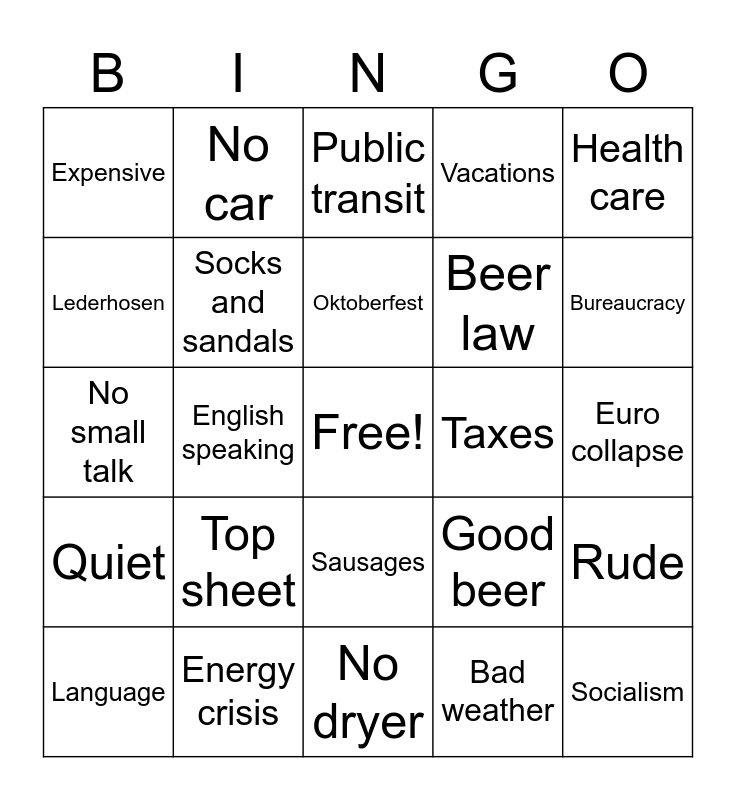 This bingo card has a free space and 24 words: Top sheet, Energy crisis, Oktoberfest, Language, Health care, Expensive, Lederhosen, No car, Taxes, Sausages, Beer law, No small talk, Good beer, Rude, Socks and sandals, Bad weather, Euro collapse, Public transit, Bureaucracy, English speaking, Socialism, Quiet, Vacations and No dryer.