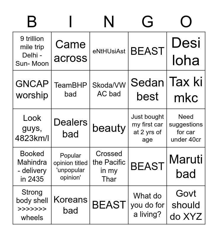 This bingo card has 25 words: Popular opinion titled 'unpopular opinion', BEAST, Skoda/VW AC bad, Strong body shell >>>>>>> wheels, Desi loha, 9 trillion mile trip Delhi - Sun- Moon, GNCAP worship, Came across, Just bought my first car at 2 yrs of age, Crossed the Pacific in my Thar, Sedan best, Look guys, 4823km/l, BEAST, Maruti bad, TeamBHP bad, Govt should do XYZ, Need suggestions for car under 40cr, eNtHUsiAst, Tax ki mkc, Dealers bad, beauty, Koreans bad, Booked Mahindra - delivery in 2435, BEAST and What do you do for a living?.