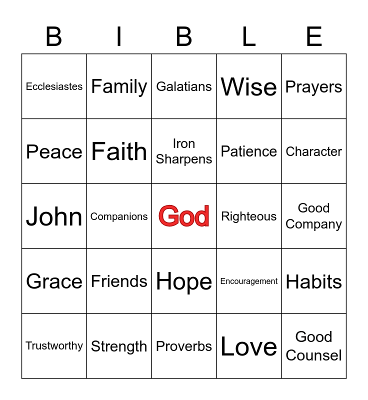 This bingo card has a free space and 24 words: Friends, Strength, Iron Sharpens, Trustworthy, Prayers, Ecclesiastes, Peace, Family, Righteous, Hope, Patience, John, Encouragement, Habits, Faith, Love, Good Company, Galatians, Character, Companions, Good Counsel, Grace, Wise and Proverbs.