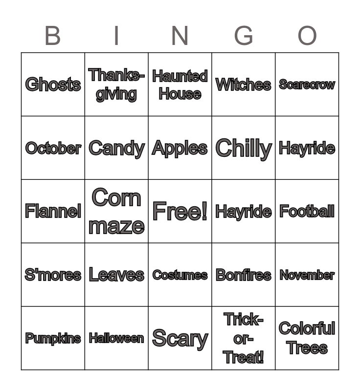 This bingo card has a free space and 24 words: Leaves, Halloween, Apples, Pumpkins, Scarecrow, Ghosts, October, Thanks-giving, Hayride, Costumes, Chilly, Flannel, Bonfires, November, Candy, Trick-or-Treat!, Football, Haunted House, Hayride, Corn maze, Colorful Trees, S'mores, Witches and Scary.