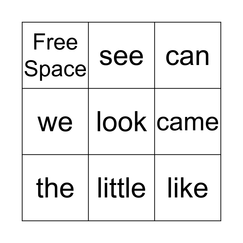 This bingo card has a free space and 8 words: came, can, see, the, Free Space, like, we and little.