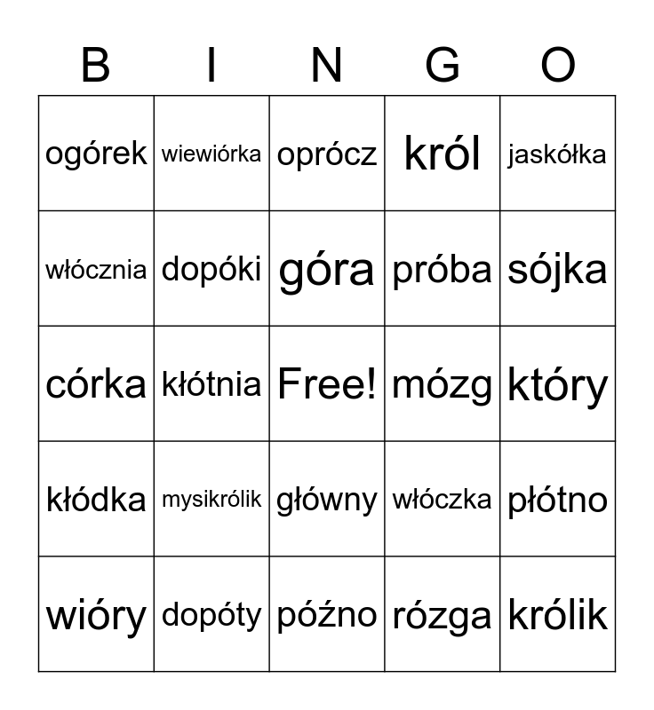 This bingo card has a free space and 41 words: chór, córka, czółno, dopóki, dopóty, główny, góra, gżegżółka, jaskółka, kłódka, kłótnia, król, królik, który, mózg, mysikrólik, ogół, ogórek, ołówek, oprócz, płótno, półka, późno, próba, przepiórka, równy, rózga, skóra, sójka, szczegół, tchórz, wiewiórka, wióry, włóczęga, włóczka, włócznia, wróbel, wspólnie, źródło, żółty and żółw.