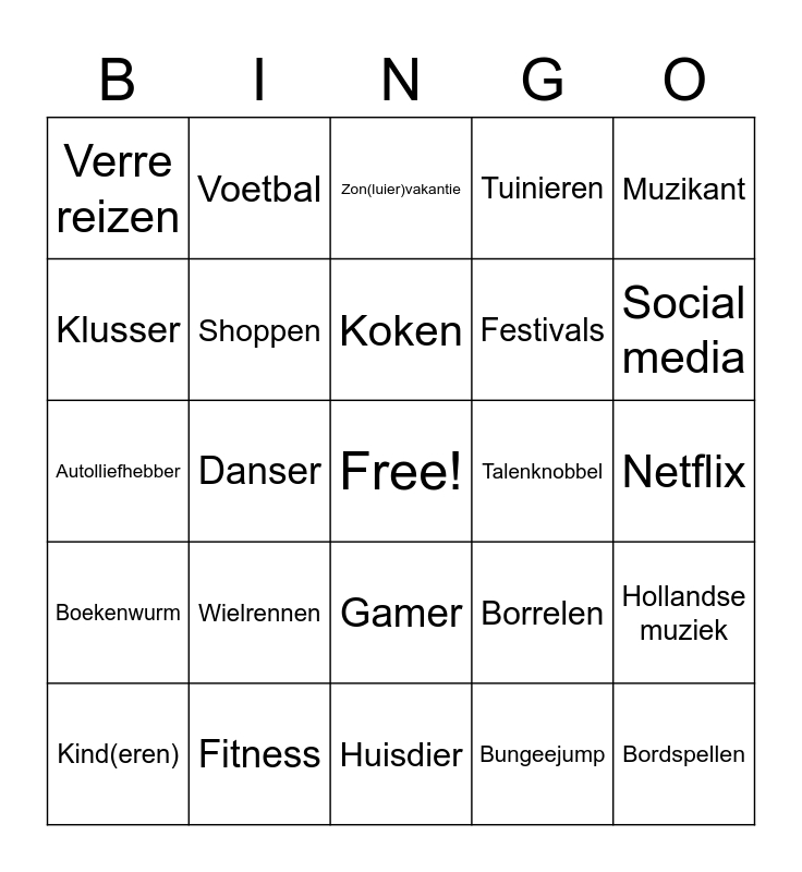 This bingo card has a free space and 24 words: Wielrennen, Fitness, Koken, Kind(eren), Muzikant, Verre reizen, Klusser, Voetbal, Talenknobbel, Gamer, Festivals, Autolliefhebber, Borrelen, Hollandse muziek, Shoppen, Bungeejump, Netflix, Zon(luier)vakantie, Social media, Danser, Bordspellen, Boekenwurm, Tuinieren and Huisdier.