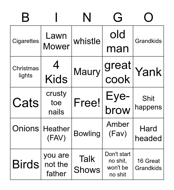 This bingo card has a free space and 34 words: Pepsi zero, Don't start no shit, won't be no shit, YEAHHH, Traveling, Onions, 4 Kids, Grandkids, Birds, Lawn Mower, Nascar, Maury, whistle, BEER, enchilada, Eye-brow, Yank, you are not the father, Cats, Heather (FAV), Amber (Fav), Bowling, 3 hots and a cot, Cigarettes, Shit happens, Talk Shows, 16 Great Grandkids, old man, water jug, great cook, Christmas lights, Best sweet tea, crusty toe nails, Hard headed and NY.
