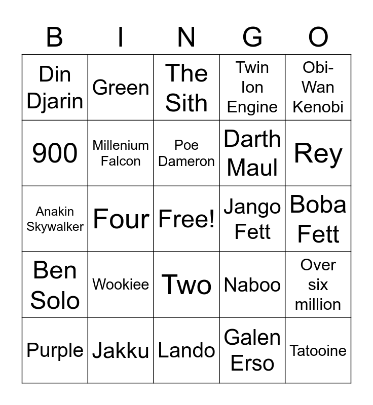 This bingo card has a free space and 38 words: Gungan, Darth Sidious, Grogu, Millenium Falcon, Over six million, Wookiee, Poe Dameron, The Darksaber, Obi-Wan Kenobi, Darth Maul, Four, Twin Ion Engine, Tatooine, Boba Fett, 900, Ben Solo, Princess Leia, The Sith, Tauntaun, Jango Fett, Din Djarin, Jakku, Rey, Purple, Yoda, Lando, Alderaan, Ahsoka Tano, Kyber Crystal, Fear, Carbonite, Two, Galen Erso, Green, Slave 1, Naboo, Anakin Skywalker and Beskar Iron.