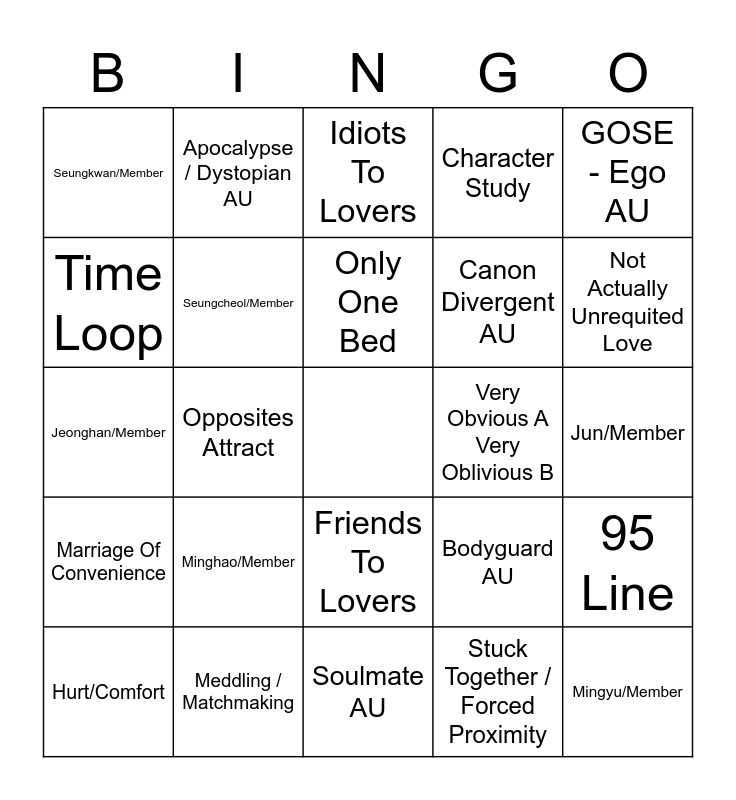 This bingo card has a free space and 116 words: 3+1 / 5+1 Things, Accidental Relationship, Acts Of Service, Angst With A Happy Ending, Arranged Marriage, Based On Other Media, Character Study, Childhood Friends, Childhood Friends To Lovers, Confessions, Domesticity, Enemies With Benefits, Enemies / Rivals To Lovers, Established Relationship, Exes To Lovers, Found Family, Friends To Lovers, Friends With Benefits, Happy Ending, Humor, Hurt/Comfort, Idiots To Lovers, Jealousy, Late-Night Conversations, Love Languages, Marriage Of Convenience, Meddling / Matchmaking, Morally Gray Characters, Mutual Pining, Non-Linear Narrative, Not Actually Unrequited Love, Only One Bed, Opposites Attract, Partners In Crime, Pining, Polyamory, Practice Kissing, Professional Partners To Lovers, Road Trip, Roommates, Secret Relationship, Sharing Dreams, Slice Of Life, Slow Burn, Soulmates, Strangers To Lovers, Stuck Together / Forced Proximity, Time Loop, Trope Subversion, Unrequited Love, Unrequited Rivalry, Very Obvious A Very Oblivious B, We Kissed Once But We Don't Talk About It, Wound Tending, Monogamous Relationship, Poly Relationship, OT13, Vocal Line, Hip Hop Line, Performance Line, 95 Line, 96 Line, 97 Line, Maknae Line, Foreign Line, Booseoksoon, Leaders, Seungcheol/Member, Jeonghan/Member, Joshua/Member, Jun/Member, Hoshi/Member, Wonwoo/Member, Woozi/Member, Dokyeom/Member, Mingyu/Member, Minghao/Member, Seungkwan/Member, Vernon/Member, Dino/Member, Angels and Demons AU, Apocalypse / Dystopian AU, Bakery AU, Bodyguard AU, Canon Divergent AU, Canon-Compliant AU, Coffee Shop AU, Crime / Criminals AU, Cyberpunk AU, Dark Academia AU, Demigods AU, Fantasy AU, Folklore / Mythology AU, GOSE - Bad Clue AU, GOSE - Ego AU, GOSE - Wonwoo's Diary AU, Heist AU, Historical AU, Hospital AU, Lawyers AU, Magical AU, Modern With Magic AU, Non-Idol Celebrity AU, Office AU, Road Trip AU, Rockstar / Band AU, Royalty AU, Science Fiction AU, Soulmate AU, Spy AU, Sugar Baby AU, Superpowers / Superhero AU, Urban Fantasy AU, Vampire AU, Wedding Planner AU and Werewolf / Shapeshifter AU.
