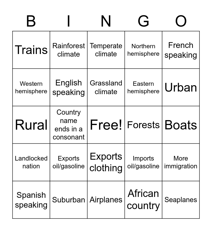 This bingo card has a free space and 34 words: Asian country, African country, Oceania country, Island nation, Landlocked nation, English speaking, French speaking, Spanish speaking, Rainforest climate, Desert climate, Grassland climate, Temperate climate, Mountains, Lakes, Forests, Urban, Suburban, Rural, Exports oil/gasoline, Imports oil/gasoline, Exports clothing, Imports food, Trains, Boats, Airplanes, Seaplanes, Northern hemisphere, Southern hemisphere, Eastern hemisphere, Western hemisphere, Country name ends in a vowel, Country name ends in a consonant, More immigration and More emigration.