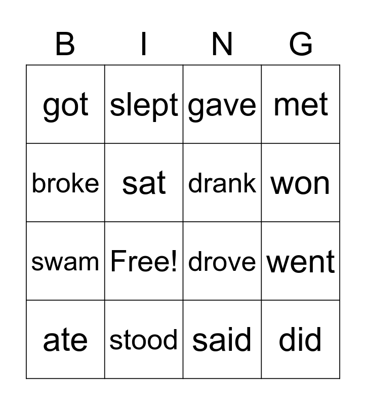 This bingo card has 20 words: went, bought, gave, came, ate, broke, stood, got, swam, slept, Free!, drove, sat, did, drank, spoke, won, met, said and made.