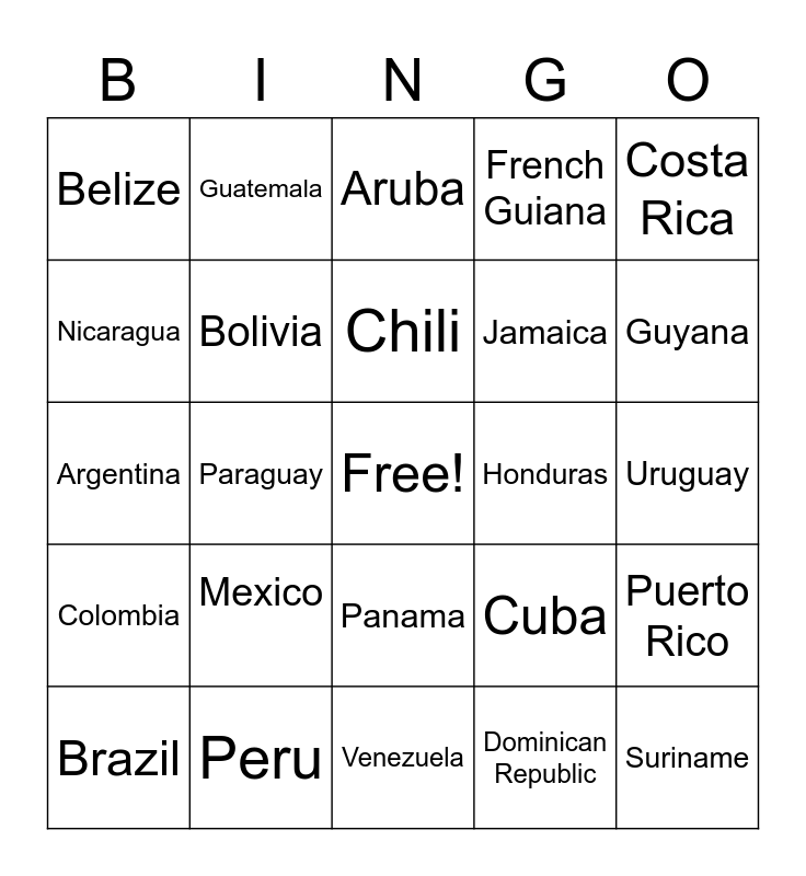 This bingo card has a free space and 24 words: Mexico, Peru, Chili, Brazil, Costa Rica, Belize, Nicaragua, Guatemala, Honduras, Panama, Jamaica, Argentina, Cuba, Puerto Rico, Bolivia, Dominican Republic, Uruguay, Aruba, Guyana, Paraguay, Suriname, Colombia, French Guiana and Venezuela.