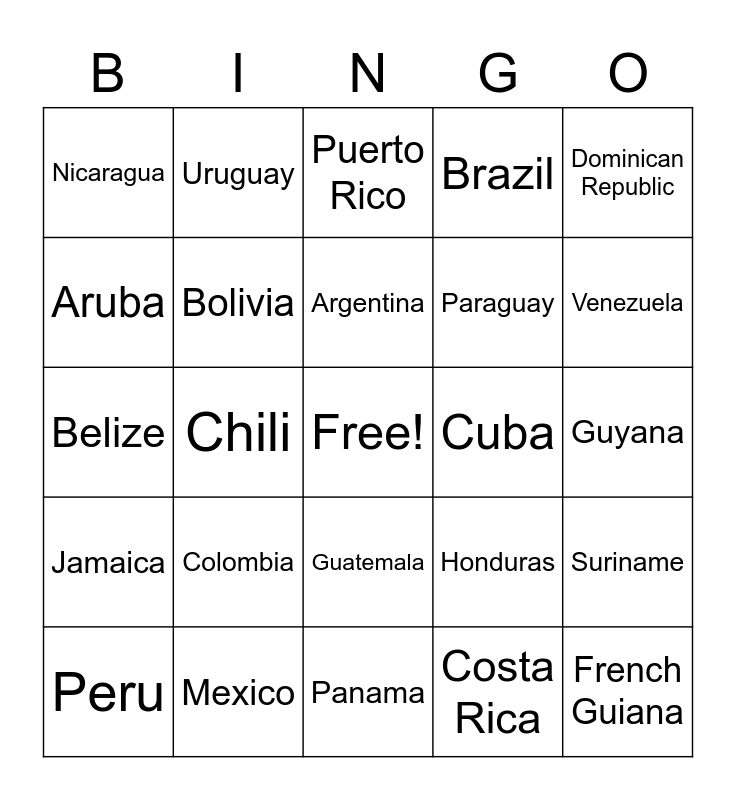 This bingo card has a free space and 24 words: Colombia, Mexico, Argentina, Peru, Dominican Republic, Nicaragua, Aruba, Uruguay, Cuba, Guatemala, Paraguay, Belize, Honduras, Suriname, Bolivia, Costa Rica, Guyana, Puerto Rico, Venezuela, Chili, French Guiana, Jamaica, Brazil and Panama.