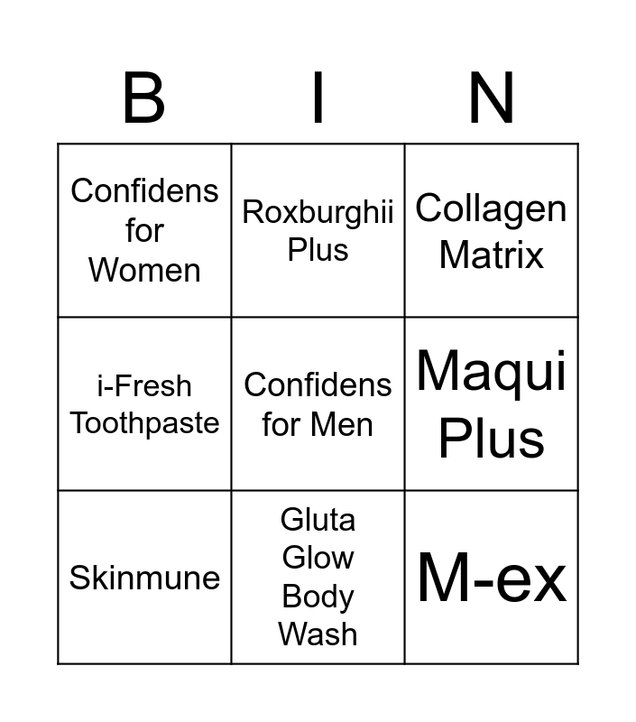 This bingo card has 24 words: Free!, Gluta Glow Body Lotion, Gluta Glow Body Wash, Secret Feminine Wash, Confidens for Men, Confidens for Women, Maqui Plus, Roxburghii Plus, Life Sential, Algae Calcium-D, M-ex, Omeg3 Plus, Calplex, Indian Gooseberry, Skinmune, Aura Booster, Perfec Radiance, Collagen Matrix, Gluta Orange, UV Expert, Gluta Lemon, Leave-on Hair Supplement, i-Fresh Toothpaste and i-Fresh Mouthwash.