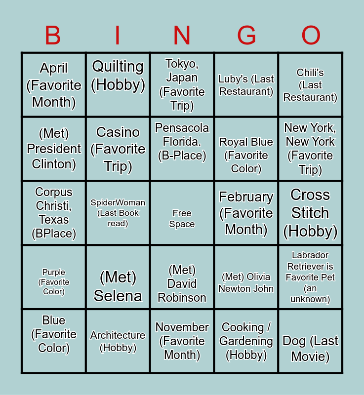 This bingo card has a free space and 24 words: Blue (Favorite Color), (Met) Selena, Pensacola Florida. (B-Place), Cooking / Gardening (Hobby), Chili's (Last Restaurant), April (Favorite Month), Quilting (Hobby), Tokyo, Japan (Favorite Trip), February (Favorite Month), Cross Stitch (Hobby), Corpus Christi, Texas (BPlace), Casino (Favorite Trip), (Met) Olivia Newton John, Labrador Retriever is Favorite Pet (an unknown), (Met) President Clinton), Architecture (Hobby), November (Favorite Month), Luby's (Last Restaurant), New York, New York (Favorite Trip), Purple (Favorite Color), SpiderWoman (Last Book read), (Met) David Robinson, Royal Blue (Favorite Color) and Dog (Last Movie).