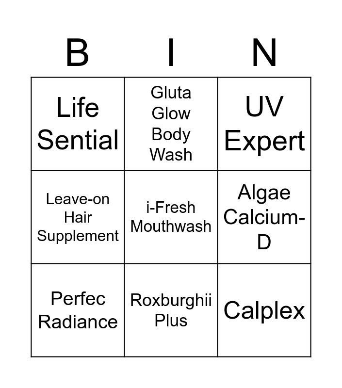 This bingo card has 24 words: Free!, Maqui Plus, Roxburghii Plus, i-Fresh Toothpaste, i-Fresh Mouthwash, Life Sential, Algae Calcium-D, Gluta Glow Body Wash, M-ex, Omeg3 Plus, Calplex, Indian Gooseberry, Skinmune, Aura Booster, Perfec Radiance, Collagen Matrix, Gluta Orange, UV Expert, Gluta Lemon, Secret Feminine Wash, Confidens for Men, Confidens for Women, Leave-on Hair Supplement and Gluta Glow Body Lotion.