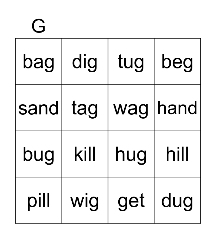 This bingo card has 22 words: wig, pig, dig, big, tag, wag, bag, tug, hug, dug, bug, beg, peg, leg, get, will, hill, pill, kill, sand, hand and band.