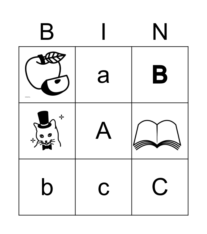 This bingo card has 3 images, a free space and 5 words: B, a, b, C and c.