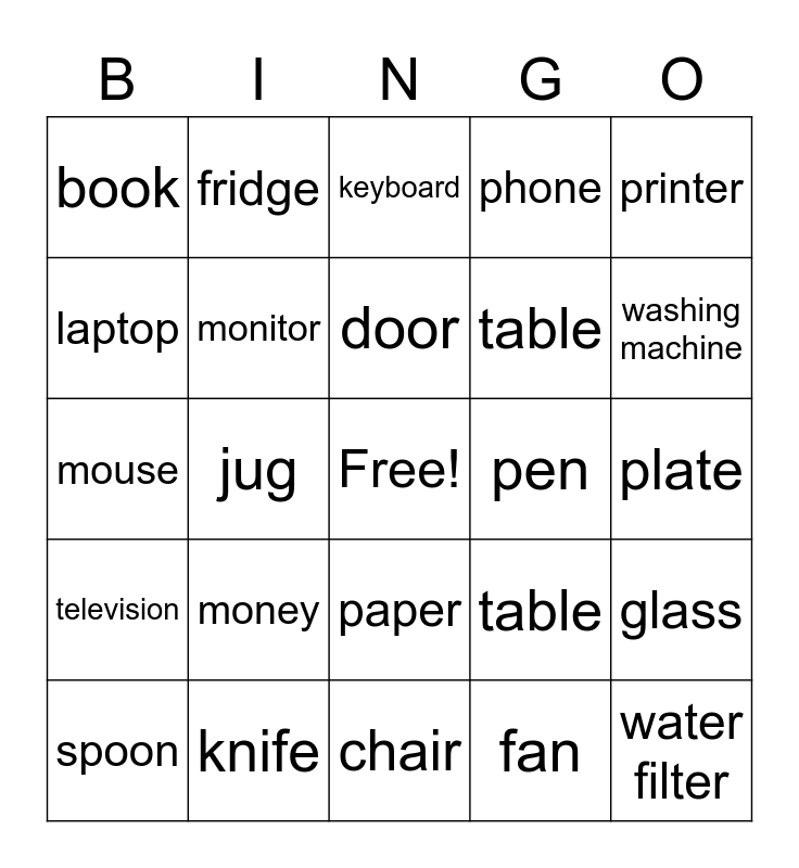 This bingo card has a free space and 24 words: money, knife, door, spoon, printer, book, laptop, fridge, pen, paper, table, mouse, table, glass, monitor, fan, plate, keyboard, washing machine, jug, water filter, television, phone and chair.