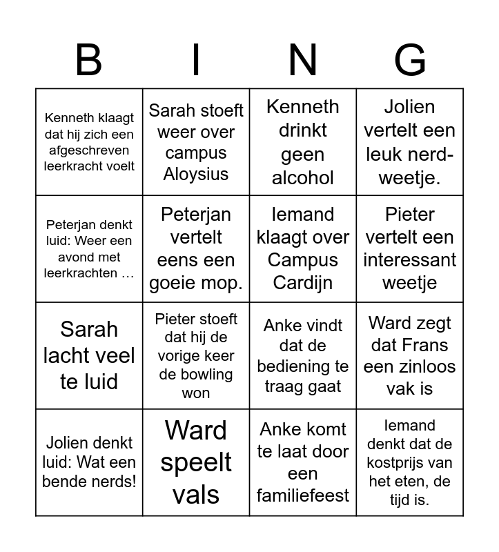 This bingo card has 16 words: Ward speelt vals, Ward zegt dat Frans een zinloos vak is, Kenneth drinkt geen alcohol, Kenneth klaagt dat hij zich een afgeschreven leerkracht voelt, Sarah lacht veel te luid, Sarah stoeft weer over campus Aloysius, Anke vindt dat de bediening te traag gaat, Anke komt te laat door een familiefeest, Peterjan denkt luid: Weer een avond met leerkrachten …, Peterjan vertelt eens een goeie mop., Jolien denkt luid: Wat een bende nerds!, Jolien vertelt een leuk nerd-weetje., Pieter stoeft dat hij de vorige keer de bowling won, Pieter vertelt een interessant weetje, Iemand klaagt over Campus Cardijn and Iemand denkt dat de kostprijs van het eten, de tijd is..