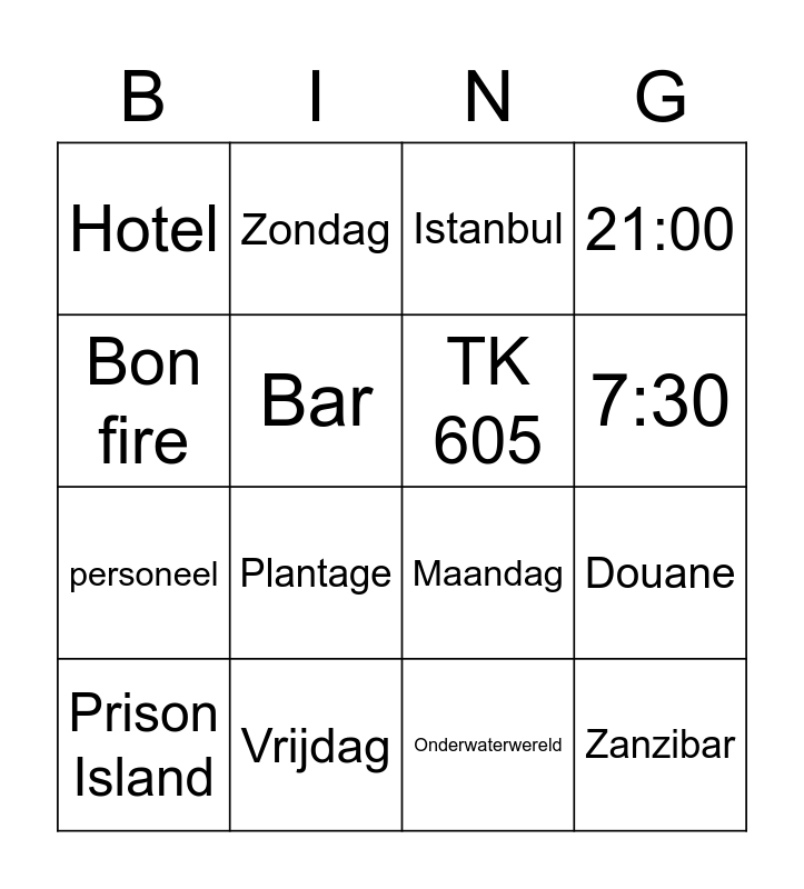 This bingo card has 16 words: Vrijdag, Douane, Istanbul, Hotel, personeel, Zondag, Maandag, Onderwaterwereld, Bon fire, Bar, Prison Island, 21:00, Plantage, 7:30, TK 605 and Zanzibar.