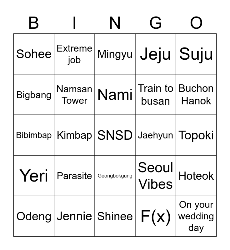 This bingo card has a free space and 24 words: Parasite, Jennie, Nami, Odeng, Suju, Sohee, Bigbang, Extreme job, Jaehyun, Geongbokgung, Train to busan, Bibimbap, Seoul Vibes, Hoteok, Namsan Tower, F(x), Topoki, Mingyu, Buchon Hanok, Kimbap, On your wedding day, Yeri, Jeju and Shinee.