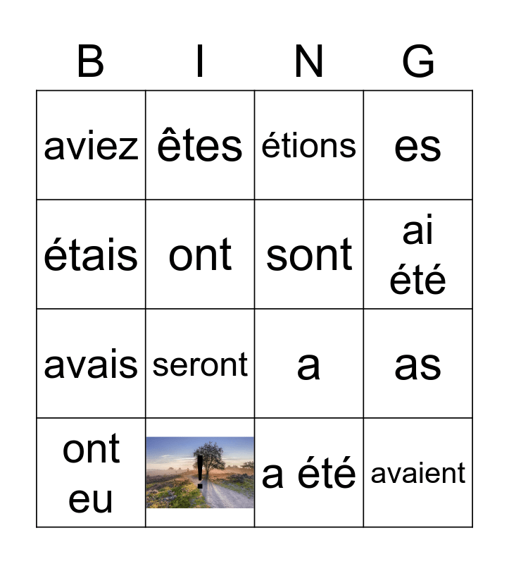 This bingo card has 1 images and 28 words: a eu, sommes, avais, suis, ont, étions, êtes, avaient, !, avons été, a, es, serai, aurons, seront, aurez, avait, sont, ai été, avions, aviez, étais, ont eu, as, a été, étions, étais and auras.