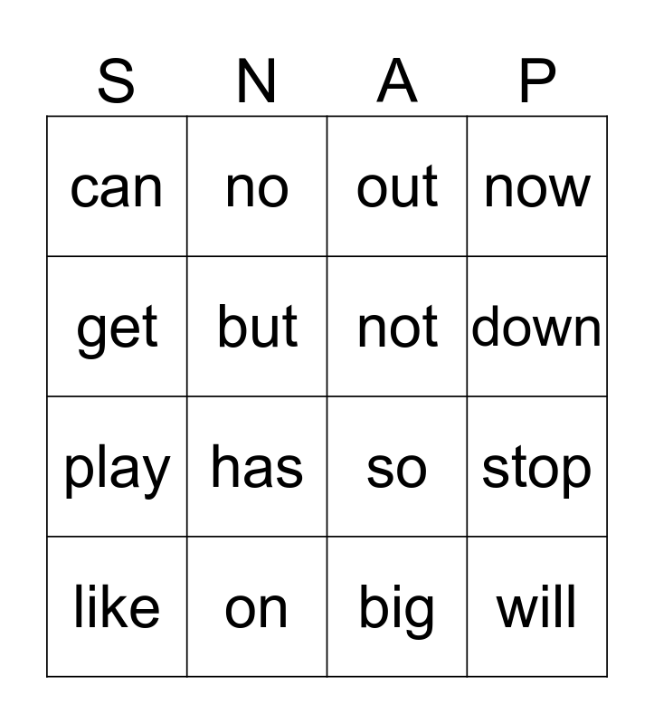 This bingo card has a free space and 15 words: like, will, out, can, down, get, has, big, but, play, stop, now, not, no and on.