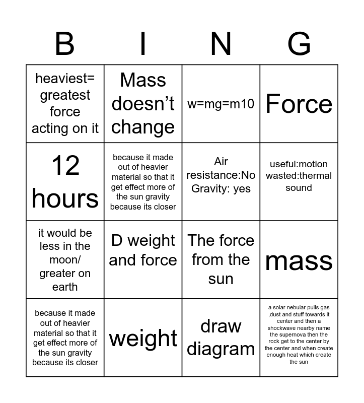 This bingo card has 16 words: weight, mass, w=mg=m10, heaviest= greatest force acting on it, it would be less in the moon/ greater on earth, Mass doesn’t change, The force from the sun, draw diagram, 12 hours, because it made out of heavier material so that it get effect more of the sun gravity because its closer, because it made out of heavier material so that it get effect more of the sun gravity because its closer, Force, D weight and force, useful:motion wasted:thermal sound, Air resistance:No Gravity: yes and a solar nebular pulls gas ,dust and stuff towards it center and then a shockwave nearby name the supernova then the rock get to the center by the center and when create enough heat which create the sun.