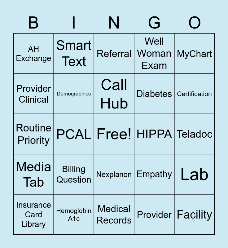 This bingo card has a free space and 100 words: Zpack, Steroids, Teladoc, RCC/CC, Paxlovid, UTI, Antibiotics, Appointment, Cough, Rash, Refill, Losartan, Alprazolam, Hemoglobin A1c, Cholesterol, Blood pressure, Diabetes, Levothyroxine, Thyroid, Metformin, Pain, Sinus, Flu, Heart rate, Diverticulitis, HIPPA, MyChart, Empathy, Warm Transfer, CSR, PCAL, AH Exchange, RN Triage, Red Flag Symptoms, Provider, Call Hub, Lab, Test, Injection, Nurse Visit, Template, High Priority, Routine Priority, Authorization, Certification, Referral, Forms, Interpreter, Medical Question, Medical Records, Medication Request, Appointment, Test Result, TOC, New Patient, Established Patient, Same Day Appointment, Preventative Exam, Well Child Visit, Well Woman Exam, Medicare AWV, Enhanced Encounters, Reschedule, BJCMG, Medical Equipment, Procedure, Occupational Therapy, Speech Therapy, Physical Therapy, Home Health, CBO, Billing Question, Estimation of Benefits, Good Faith Estimate, Call Backs, Access Center, Provider Admin, Provider Clinical, Staff Pool, InBasket, EPIC, Facility, IUD, Nexplanon, Practice Admin, Smart Text, Immunization, CIOX, ROI, Media Tab, Pharmacy, Vendor, INR/PT Results, Insurance Card Library, Demographics, Guarantor, Registration, Fast Pass, Provider Finder and 3 Point Check.