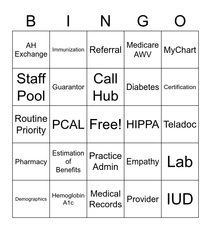This bingo card has a free space and 100 words: Zpack, Steroids, Teladoc, RCC/CC, Paxlovid, UTI, Antibiotics, Appointment, Cough, Rash, Refill, Losartan, Alprazolam, Hemoglobin A1c, Cholesterol, Blood pressure, Diabetes, Levothyroxine, Thyroid, Metformin, Pain, Sinus, Flu, Heart rate, Diverticulitis, HIPPA, MyChart, Empathy, Warm Transfer, CSR, PCAL, AH Exchange, RN Triage, Red Flag Symptoms, Provider, Call Hub, Lab, Test, Injection, Nurse Visit, Template, High Priority, Routine Priority, Authorization, Certification, Referral, Forms, Interpreter, Medical Question, Medical Records, Medication Request, Test Result, TOC, New Patient, Established Patient, Same Day Appointment, Preventative Exam, Well Child Visit, Well Woman Exam, Medicare AWV, Enhanced Encounters, Reschedule, BJCMG, Medical Equipment, Procedure, Occupational Therapy, Speech Therapy, Physical Therapy, Home Health, CBO, Billing Question, Estimation of Benefits, Good Faith Estimate, Call Backs, Access Center, Provider Admin, Provider Clinical, Staff Pool, InBasket, EPIC, Facility, IUD, Nexplanon, Practice Admin, Smart Text, Immunization, CIOX, ROI, Media Tab, Pharmacy, Vendor, INR/PT Results, Insurance Card Library, Demographics, Guarantor, Registration, Fast Pass, Provider Finder, 3 Point Check and Emergency Contact.