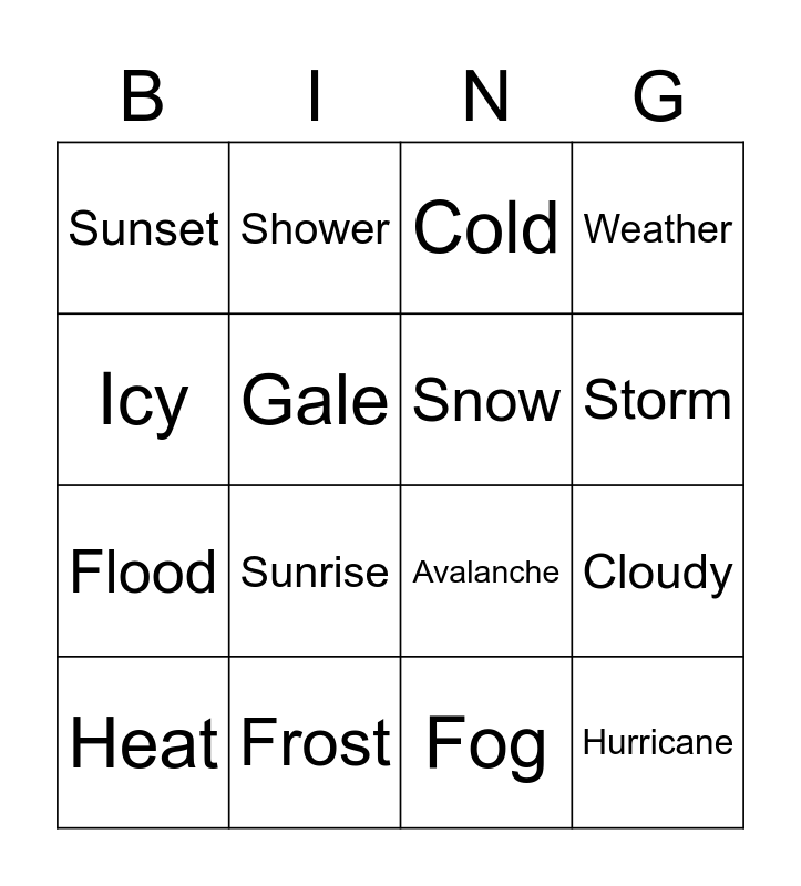 This bingo card has 36 words: Sun, Windy, Rain, Snow, Sleet, Hurricane, Storm, Hail Stones, Icy, Drizzle, Cloudy, Weather, Rainbow, Frost, Sunrise, Sunset, Drought, Tropical, Heat, Cold, Fog, Lightning, Breeze, Humid, Overcast, Shower, Avalanche, Monsoon, Flood, Gale, Mist, Whirlwind, Thunder, Smog, Blizzard and Tornado.