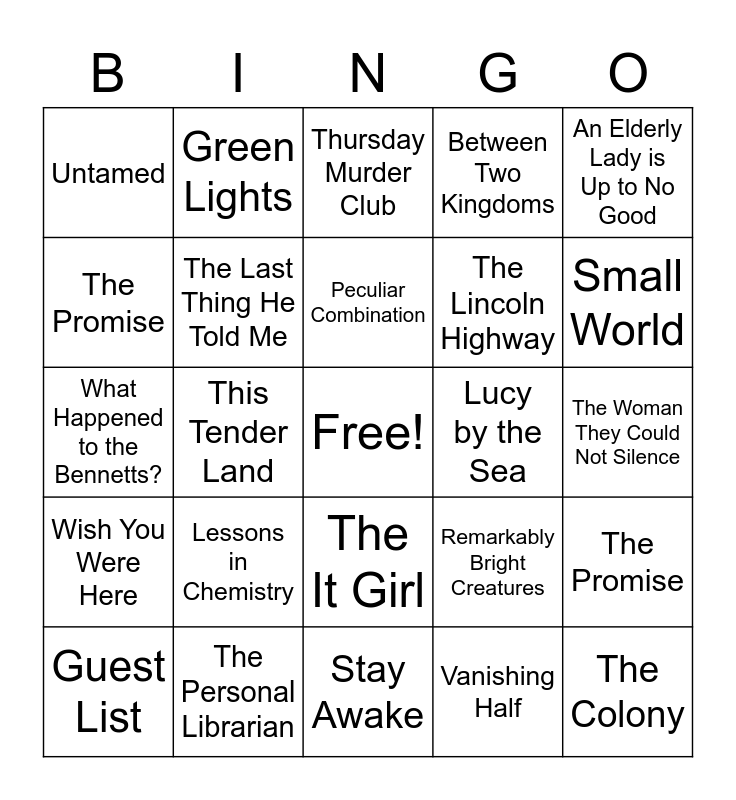 This bingo card has a free space and 24 words: Lessons in Chemistry, The Personal Librarian, Peculiar Combination, Guest List, An Elderly Lady is Up to No Good, Untamed, The Promise, Green Lights, Lucy by the Sea, The It Girl, The Lincoln Highway, What Happened to the Bennetts?, Remarkably Bright Creatures, The Promise, The Last Thing He Told Me, Vanishing Half, The Woman They Could Not Silence, Thursday Murder Club, Small World, This Tender Land, The Colony, Wish You Were Here, Between Two Kingdoms and Stay Awake.