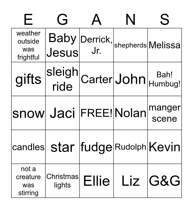 This bingo card has a free space and 24 words: star, Christmas lights, Carter, not a creature was stirring, Melissa, weather outside was frightful, gifts, Baby Jesus, Nolan, fudge, John, snow, Rudolph, Kevin, sleigh ride, Liz, manger scene, Derrick, Jr., Bah! Humbug!, Jaci, G&G, candles, shepherds and Ellie.
