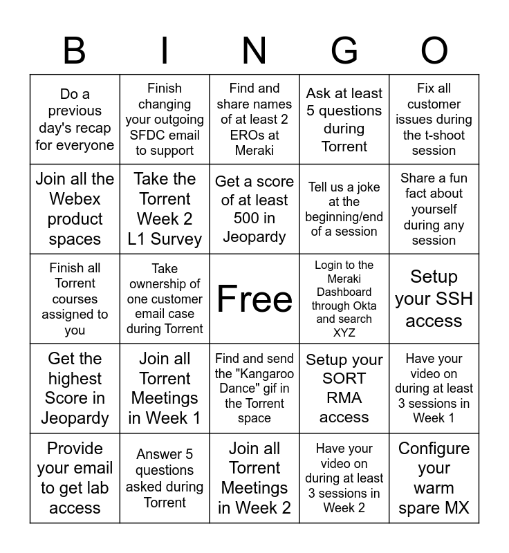This bingo card has a free space and 24 words: Join all Torrent Meetings in Week 1, Answer 5 questions asked during Torrent, Get a score of at least 500 in Jeopardy, Provide your email to get lab access, Fix all customer issues during the t-shoot session, Do a previous day's recap for everyone, Join all the Webex product spaces, Finish changing your outgoing SFDC email to support, Login to the Meraki Dashboard through Okta and search XYZ, Find and send the "Kangaroo Dance" gif in the Torrent space, Tell us a joke at the beginning/end of a session, Finish all Torrent courses assigned to you, Setup your SORT RMA access, Have your video on during at least 3 sessions in Week 1, Take the Torrent Week 2 L1 Survey, Have your video on during at least 3 sessions in Week 2, Setup your SSH access, Find and share names of at least 2 EROs at Meraki, Share a fun fact about yourself during any session, Take ownership of one customer email case during Torrent, Configure your warm spare MX, Get the highest Score in Jeopardy, Ask at least 5 questions during Torrent and Join all Torrent Meetings in Week 2.