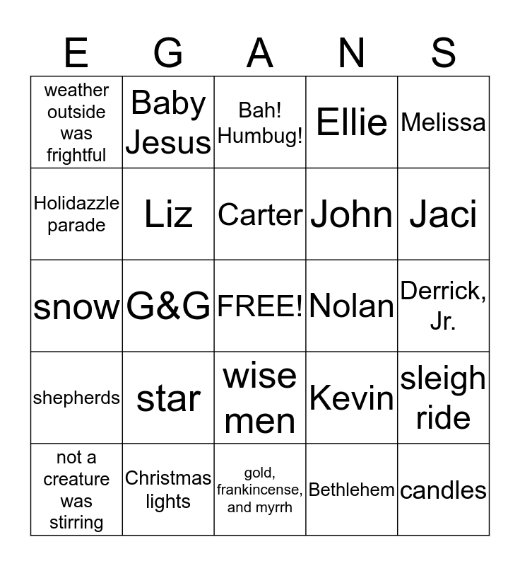 This bingo card has a free space and 24 words: star, Christmas lights, Carter, not a creature was stirring, Melissa, weather outside was frightful, Holidazzle parade, Baby Jesus, Nolan, wise men, John, snow, Kevin, sleigh ride, Liz, Bethlehem, Derrick, Jr., Bah! Humbug!, Jaci, G&G, candles, shepherds, Ellie and gold, frankincense, and myrrh.
