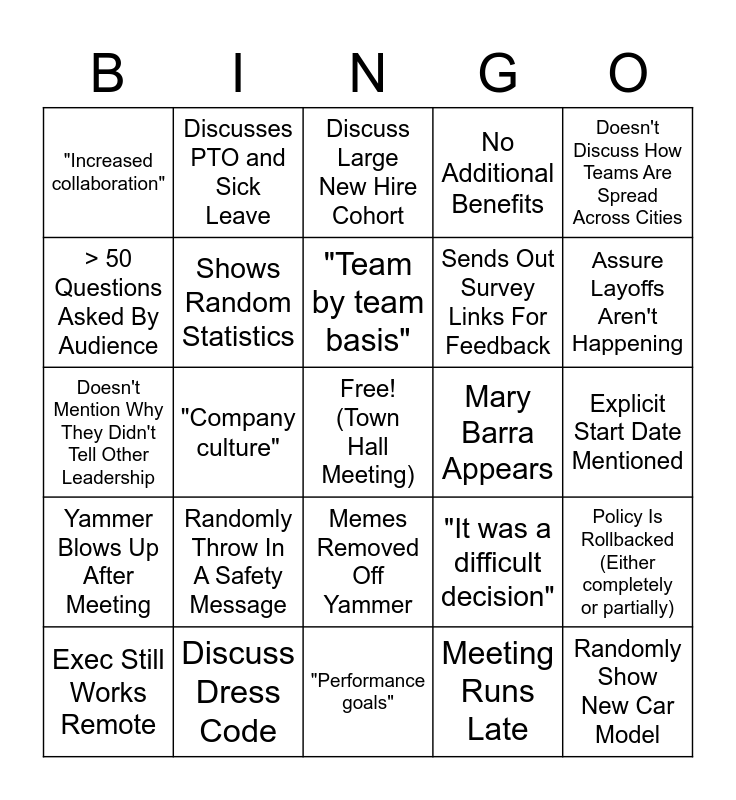 This bingo card has a free space and 24 words: Randomly Throw In A Safety Message, Discuss Dress Code, "Team by team basis", Exec Still Works Remote, Doesn't Discuss How Teams Are Spread Across Cities, "Increased collaboration", > 50 Questions Asked By Audience, Discusses PTO and Sick Leave, Mary Barra Appears, Memes Removed Off Yammer, Sends Out Survey Links For Feedback, Doesn't Mention Why They Didn't Tell Other Leadership, "It was a difficult decision", Policy Is Rollbacked (Either completely or partially), Shows Random Statistics, Meeting Runs Late, Explicit Start Date Mentioned, Discuss Large New Hire Cohort, Assure Layoffs Aren't Happening, "Company culture", Randomly Show New Car Model, Yammer Blows Up After Meeting, No Additional Benefits and "Performance goals".