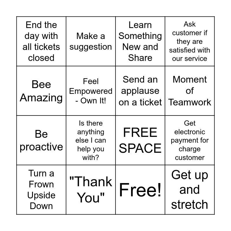 This bingo card has 17 words: Free!, Turn a Frown Upside Down, Learn Something New and Share, End the day with all tickets closed, Is there anything else I can help you with?, Ask customer if they are satisfied with our service, Get electronic payment for charge customer, Send an applause on a ticket, Moment of Teamwork, Feel Empowered - Own It!, "Thank You", FREE SPACE, Bee Amazing, Make a suggestion, Be proactive, Positive RM interaction and Get up and stretch.