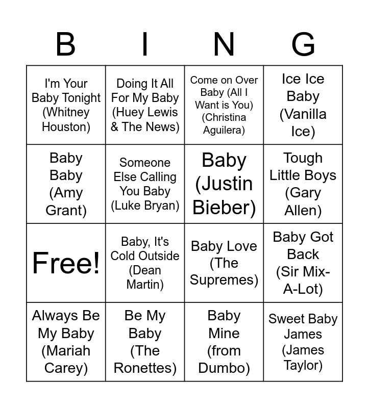 This bingo card has 20 words: Baby Got Back (Sir Mix-A-Lot), Don't Worry Baby (Beach Boys), Come on Over Baby (All I Want is You) (Christina Aguilera), Baby Blue (George Strait), Always Be My Baby (Mariah Carey), Baby Baby (Amy Grant), Be My Baby (The Ronettes), I'm Your Baby Tonight (Whitney Houston), Free!, Doing It All For My Baby (Huey Lewis & The News), Baby, It's Cold Outside (Dean Martin), Baby Love (The Supremes), Someone Else Calling You Baby (Luke Bryan), Sweet Baby James (James Taylor), Baby (Justin Bieber), Baby I Need Your Loving (The Four Tops), Tough Little Boys (Gary Allen), Ice Ice Baby (Vanilla Ice), Baby Mine (from Dumbo) and Baby I Love Your Way (Peter Frampton).