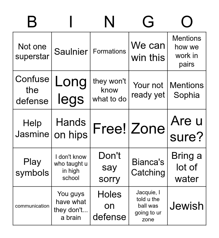This bingo card has a free space and 29 words: communication, Learn ur plays, Hands on hips, Be prepared, Not one superstar, Formations, Long legs, I don't know who taught u in high school, Zone, You guys have what they don't... a brain, Are u sure?, Jewish, Holes on defense, Jacquie, I told u the ball was going to ur zone, Mentions Sophia, Center zone defense, Don't say sorry, Play symbols, Mentions how we work in pairs, Help Jasmine, Bianca's Catching, Shade in/out, Your not ready yet, Confuse the defense, We can win this, Saulnier, Bring a lot of water, they won't know what to do and I coach her for 5 years.