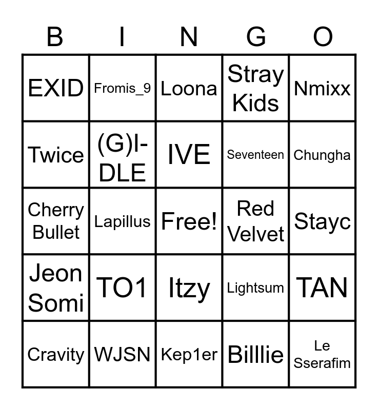 This bingo card has a free space and 24 words: TO1, WJSN, IVE, Cravity, Nmixx, EXID, Twice, Fromis_9, Red Velvet, Itzy, Seventeen, Cherry Bullet, Lightsum, TAN, (G)I-DLE, Billlie, Stayc, Loona, Chungha, Lapillus, Le Sserafim, Jeon Somi, Stray Kids and Kep1er.